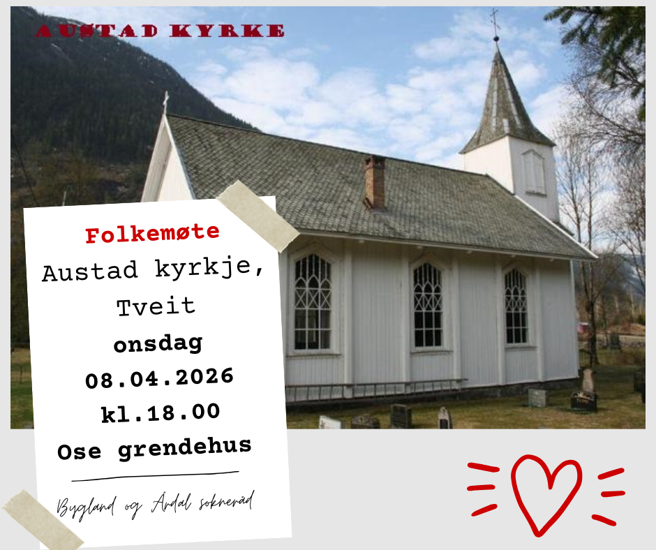 Velkomen til folkemøte om Austad kyrkje på Tveit, onsdag 8. april kl. 18.00 på Ose grendehus