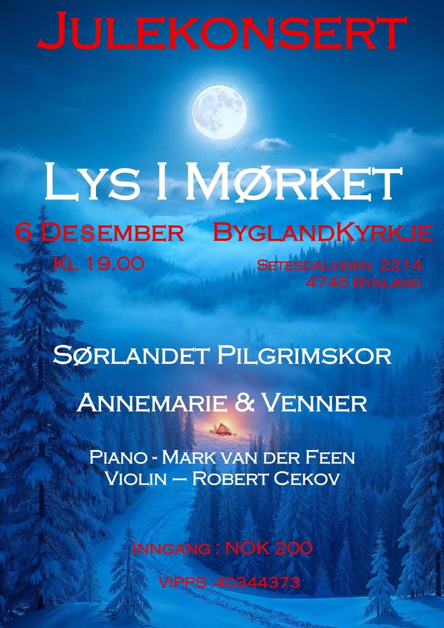 Den 6. desember 2025 klokken 19:00 ønsker vi velkommen til en unik juleopplevelse i Bygland kyrkje, Setesdalsvegen 2214 4745 Bygland. Sørlandet Pilgrimskoor gir en storslått julekonsert i samarbeid med sangere fra Nederland. Dirigent for begge ensemblet, den nederlandske sopranen Annemarie de Jong, bosatt i Grendi, har slått de to små ensemblet sammen for en kveld fylt med vakker musikk. To musikere fra Annemaries nederlandske orkester, pianist og fiolinist, vil også bidra med akkompagnement, og programmet er variert og spennende – med noe for enhver smak.